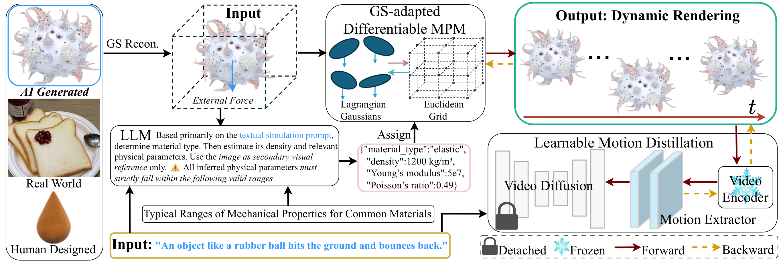 Overview. MotionPhysics simulates physically consistent dynamics from text-guided input prompts by automatically estimating physical parameters for diverse input scenes, including AI-generated, real-world, and human-designed assets.